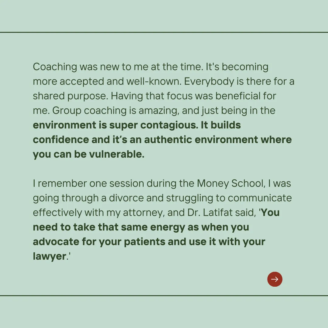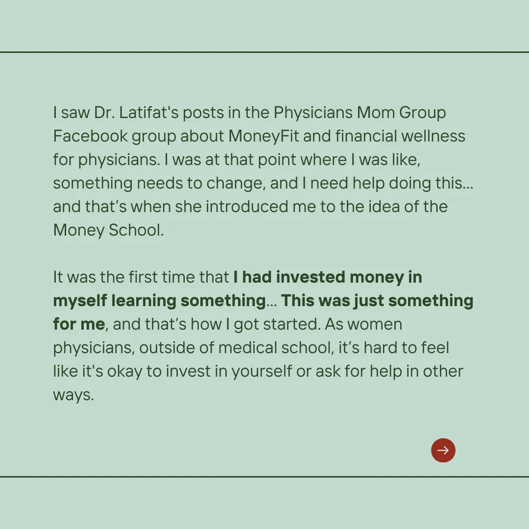 A 12-month financial coaching community for women physicians, offering weekly calls, a private community, and an exclusive member-only podcast. Dive into improving your financial status while focusing on achieving what you truly want out of life.